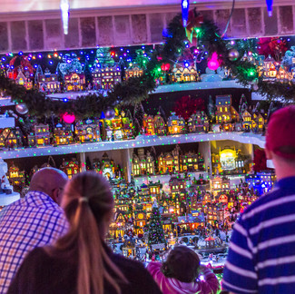 Первая: собрание игрушечных рождественских домиков. Это не меньше сотни маленьких макетов украшенных к Новому Году или Рождеству домов, которые образуют улицы с пешеходами и автомобилями. Все дома электрифицированы: в них горит освещение, уличные фонари, подсвечены вывески, на которых читаются копии где-то когда-то существовавших надписей. Домики прошлого-позапрошлого веков, видно коллекция собиралась не одним поколением этой семьи.